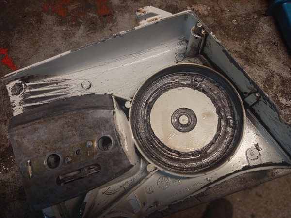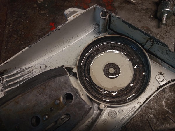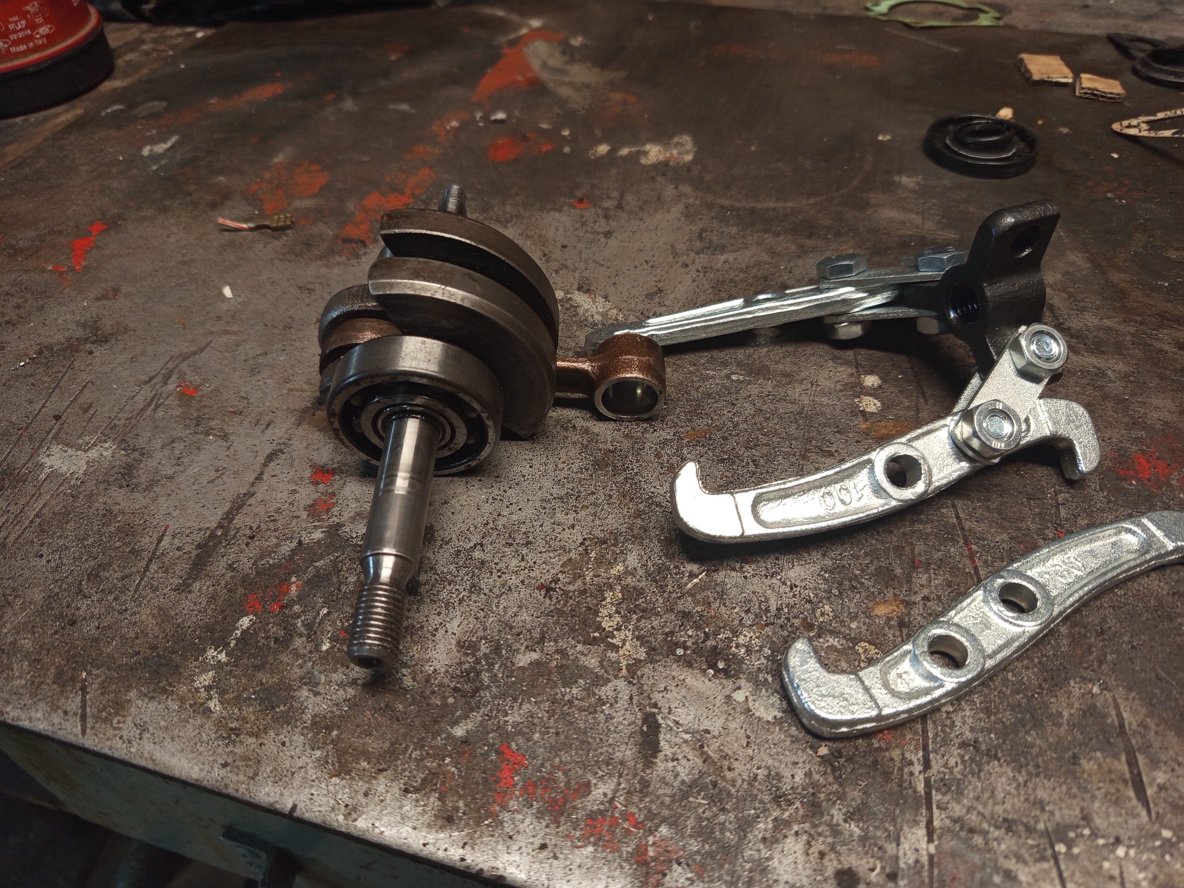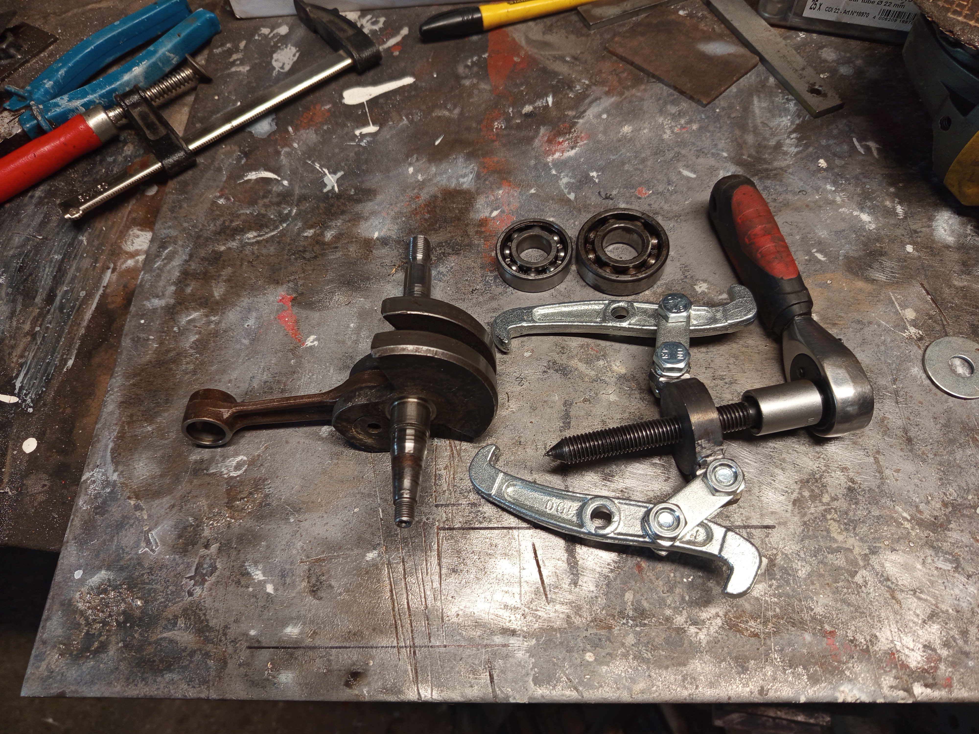 Before doing the cosmetics part, there was one more thing to take apart. The bearing remained on the cranckshaft, and had to be pulled off. Of course it’s not a big deal with a bearing puller, but a tiny problem is that I didn’t have the proper puller for this job. I have a set of those three arm bearing pullers, but of course you can’t fit all three arms under the bearing here, what’s needed is a two arm puller.