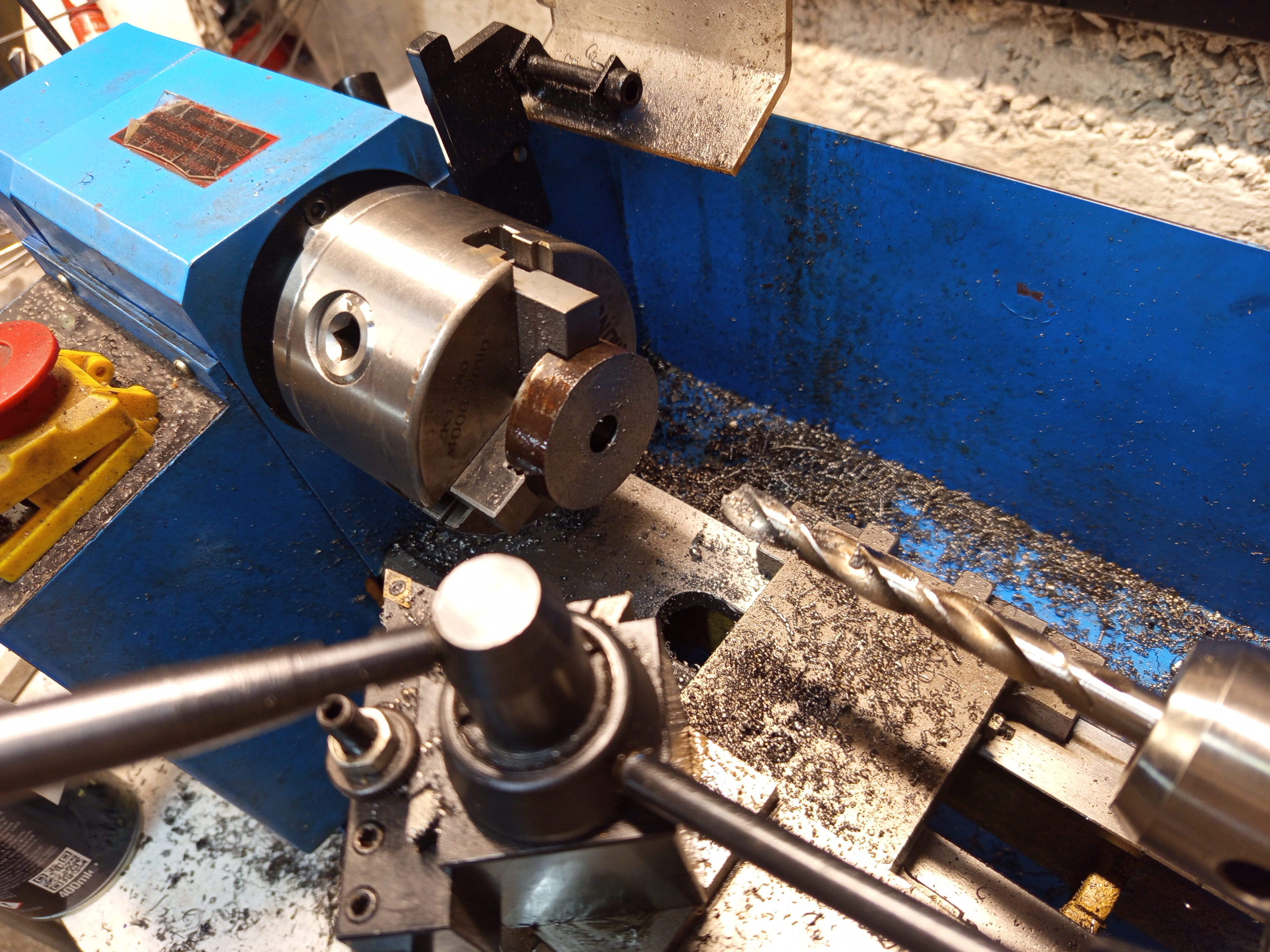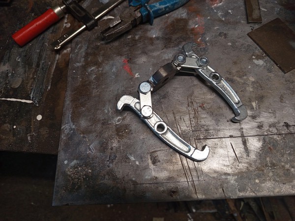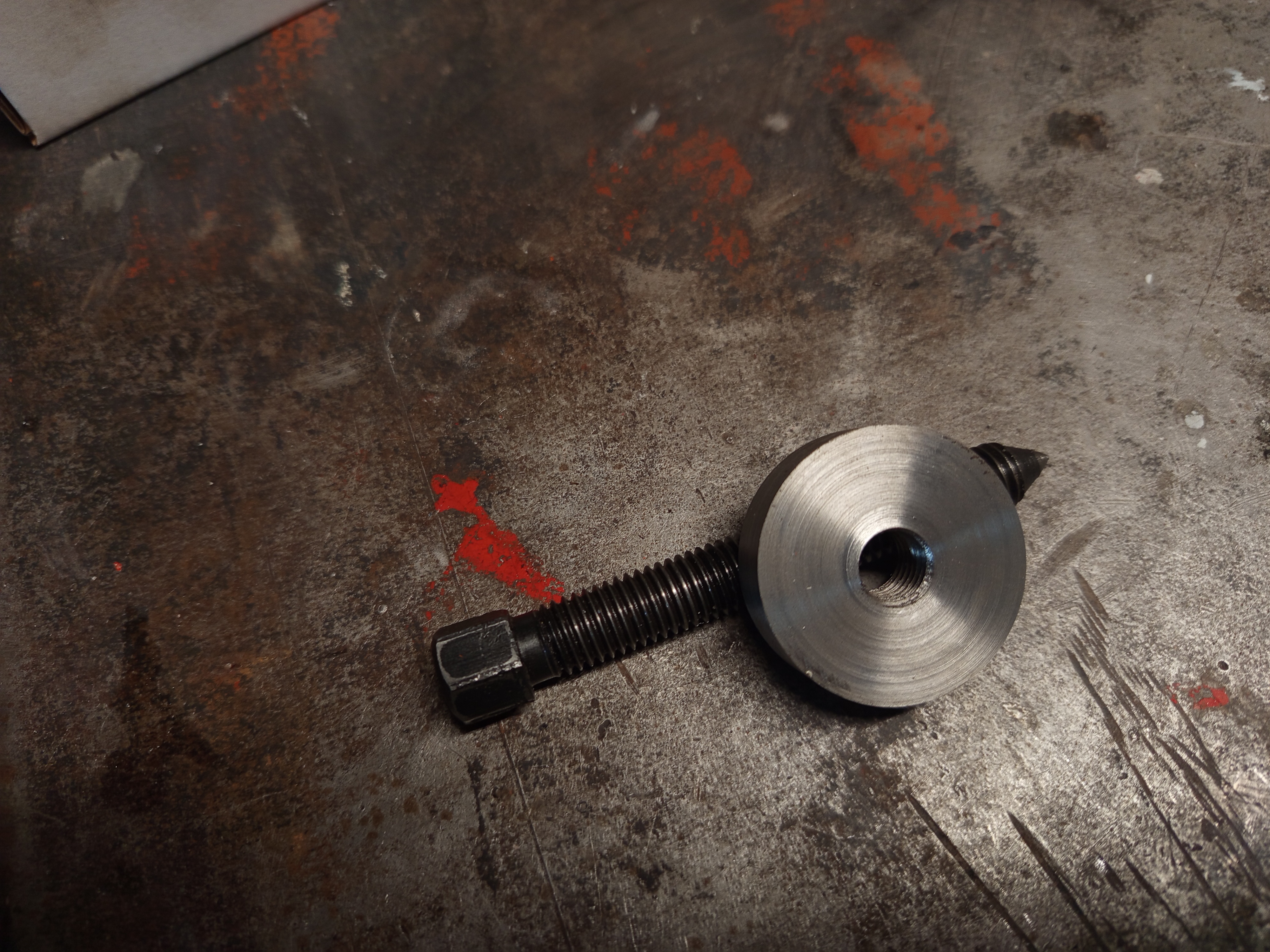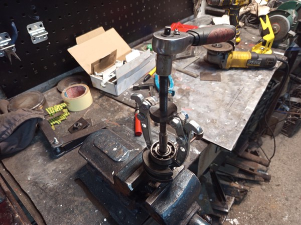 But with a small modification I could reuse it. I used a leftover round bar, faced it and tapped an M12 thread in it, and welded two nuts on it. And that’s my crude two arm puller, not nice, but it worked as needed.