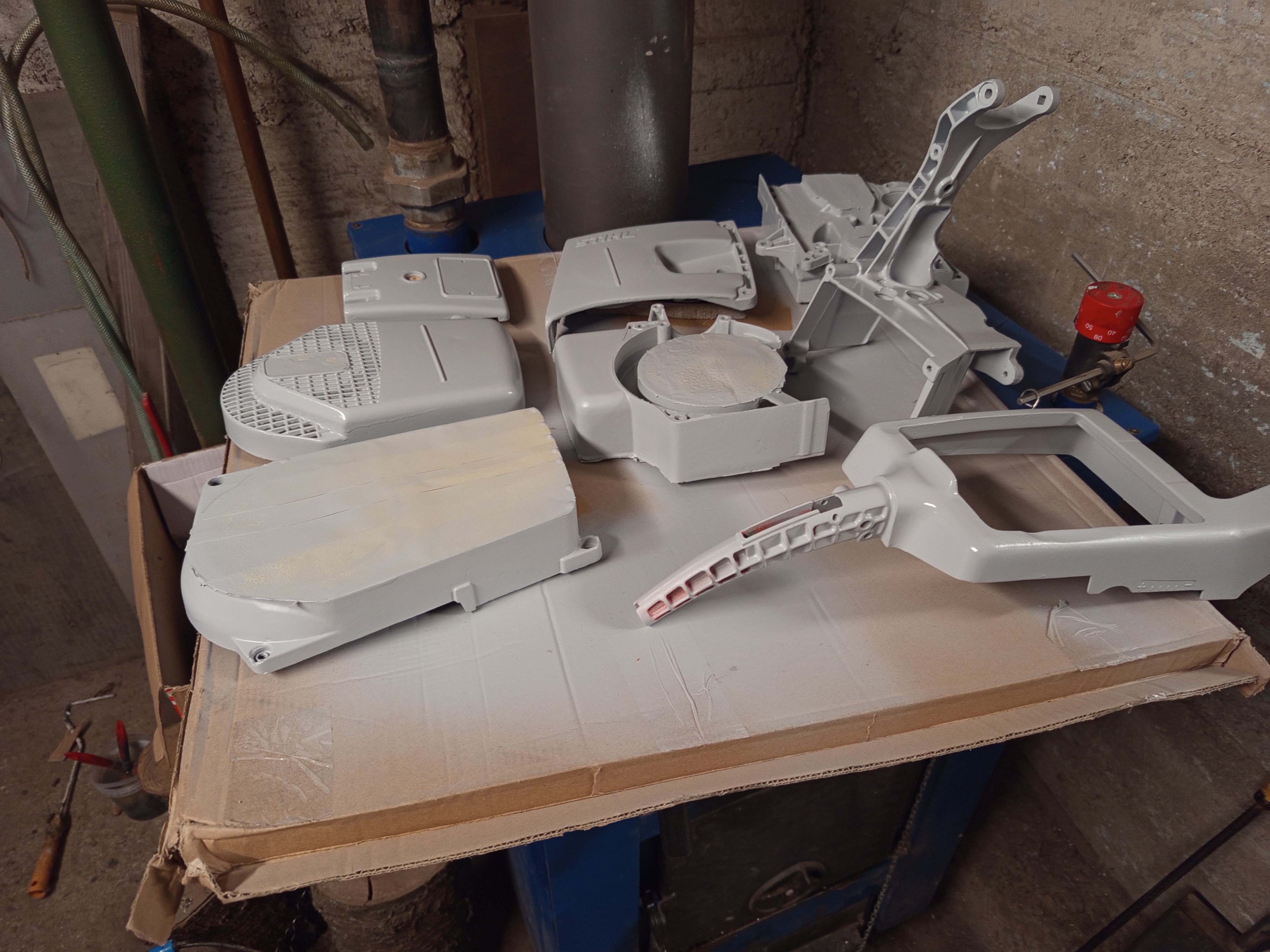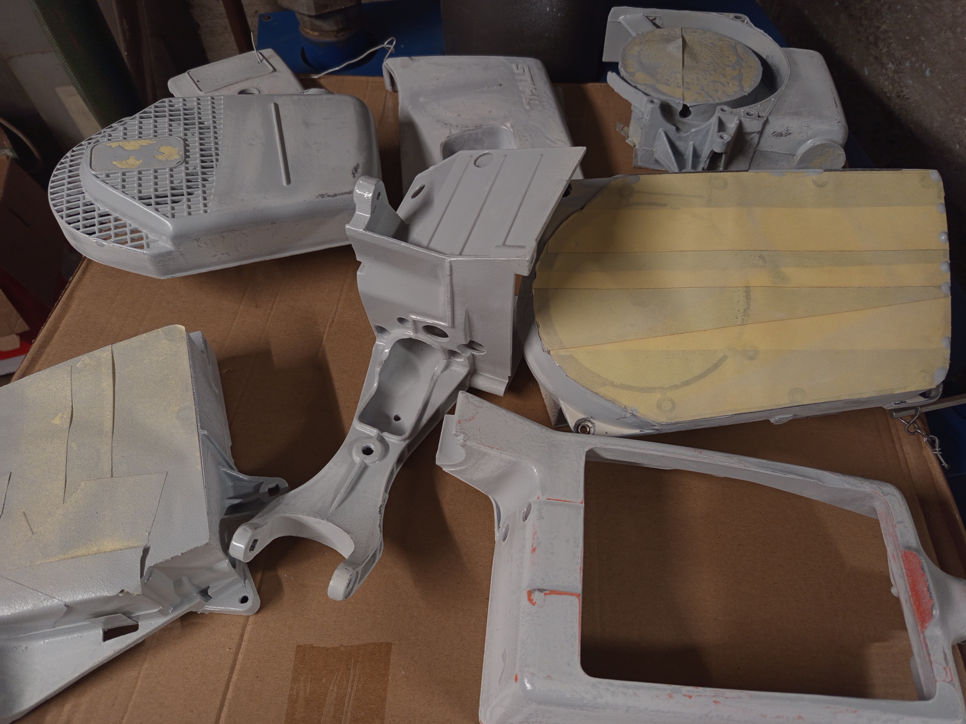 Nothing exciting here, I applied a layer of primer on each part, and after it dried, I sanded off the few drips or areas where it didn’t cover properly, because whenever I attempt spray painting I just can’t get the amount of patin right, well it’s still not my favorite job to do, probably beacuse I’m not good at it. But anyway, a few days later I painted the colors too, and it turned out okay. The only thing I skipped here is the exhaust cover, the original one is a bit broken, I found an aftermarket part, and didn’t arrive at this point, but painted that one later on, as it was of course a bit different kind of white.