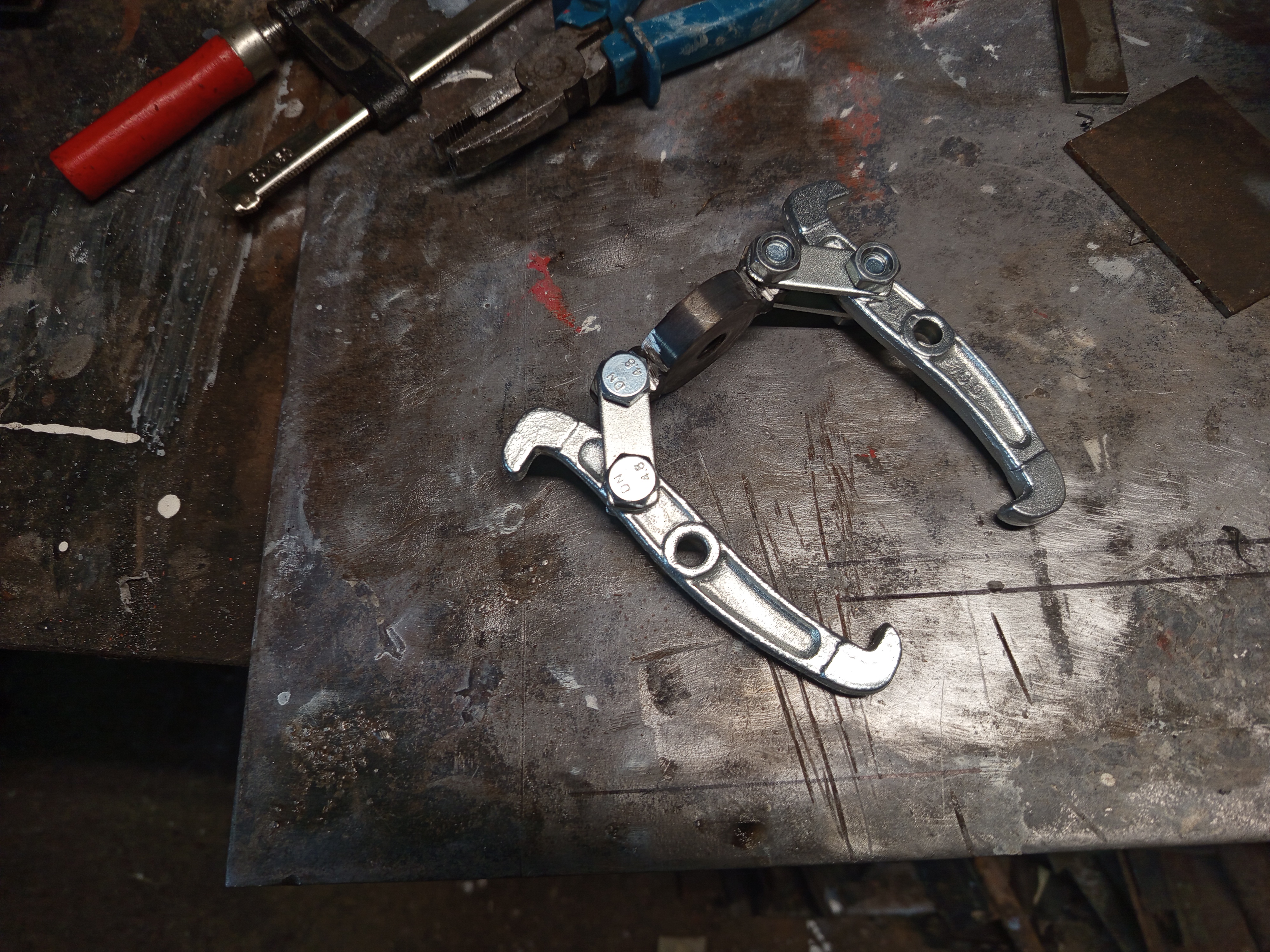 But with a small modification I could reuse it. I used a leftover round bar, faced it and tapped an M12 thread in it, and welded two nuts on it. And that’s my crude two arm puller, not nice, but it worked as needed.