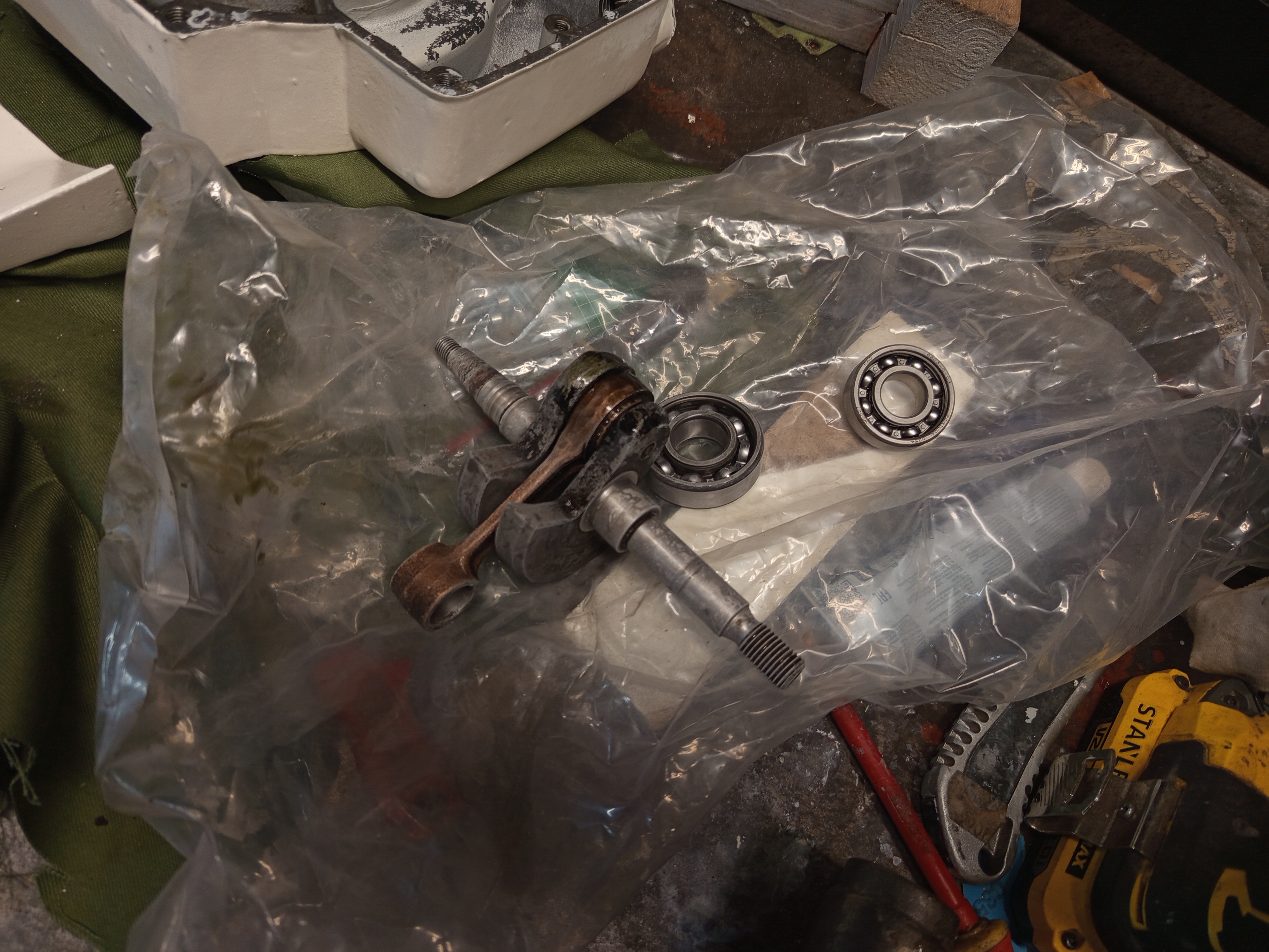 To make it easy and somewhat ‘professional’, I put the crankshaft and the bearings into the freezer until it cooled down properly, this way you can just push the new bearing in by hand into the heated up bearing seats without any hammering or forcing.
